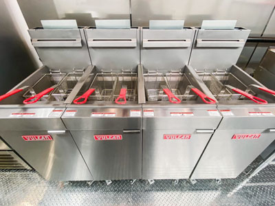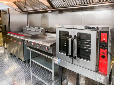 This 24' mobile kitchen trailer (unit 24-071) is equipped with a range of appliances including a 36" flattop griddle, double convection oven, deep fryer, six burner range and more.
