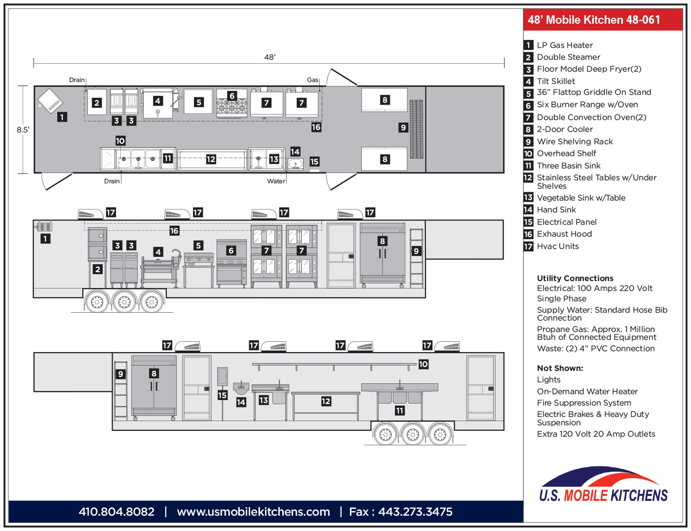 This 48' mobile kitchen trailer (unit 48-061) delivers high-performance foodservice capability in a mobile, self-contained unit. From setup to service, it’s designed for resilience and volume.