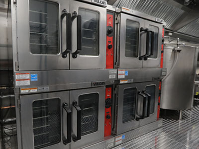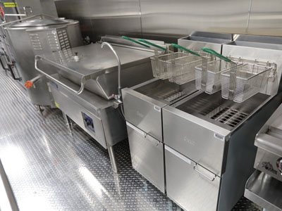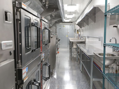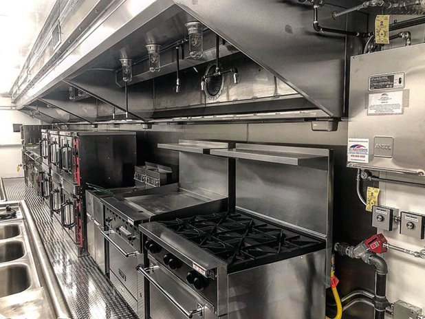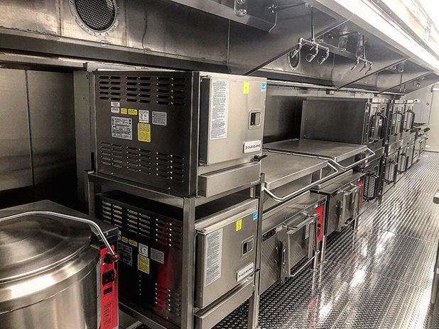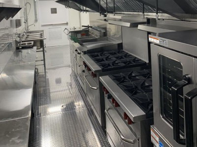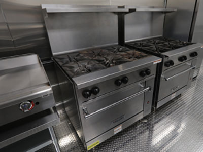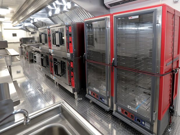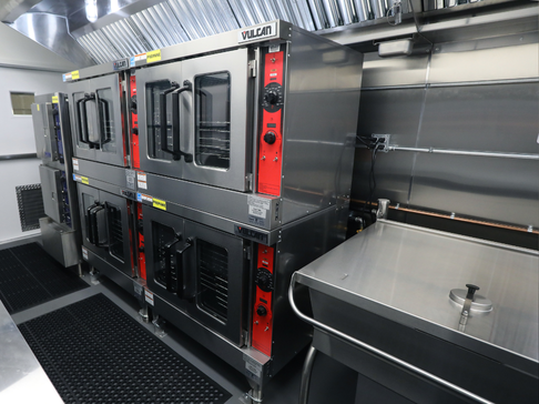 The unique layout and features of this 53' kitchen trailer (unit 53-004) offers massive foodservice capabilities. It features a refrigerator unit with cutting board top, utility room, clean dish table, six burner range with oven, double convection oven, warming cabinet and more.