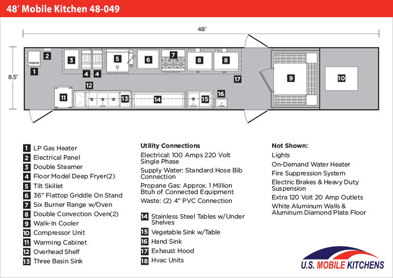 Units that are setup with 100% electric appliances may require between 200A & 600A 208V 3-Phase electrical feed, vs. a 100A 220V Single Phase feed for units equipped with gas appliances. Please ensure that your site will be able to meet these requirements. All installations require a licensed electrician. For more detailed information, call