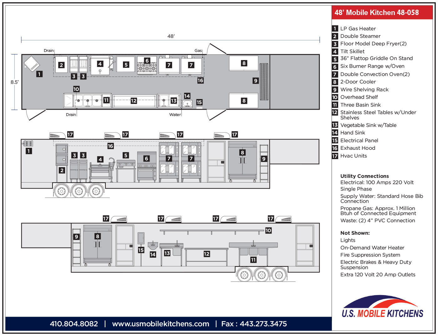 This drawing is the property of U.S. Mobile Kitchens. All ideas, designs, arrangements, graphic techniques and plans indicated by this drawing are owned by and the property of U.S. Mobile Kitchens, and were developed for our sole use or in connection with this specific project. None of the ideas, designs or plans shall be used by or disclosed to any person, firm or corporation for any purpose whatsoever without U.S. Mobile Kitchens written permission.
