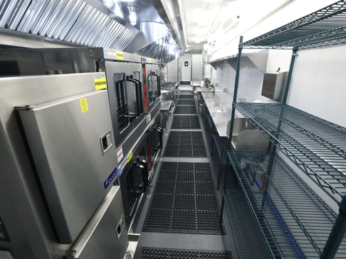 The unique layout and features of this 53' kitchen trailer (unit 53-004) offers massive foodservice capabilities. It features a refrigerator unit with cutting board top, utility room, clean dish table, six burner range with oven, double convection oven, warming cabinet and more.